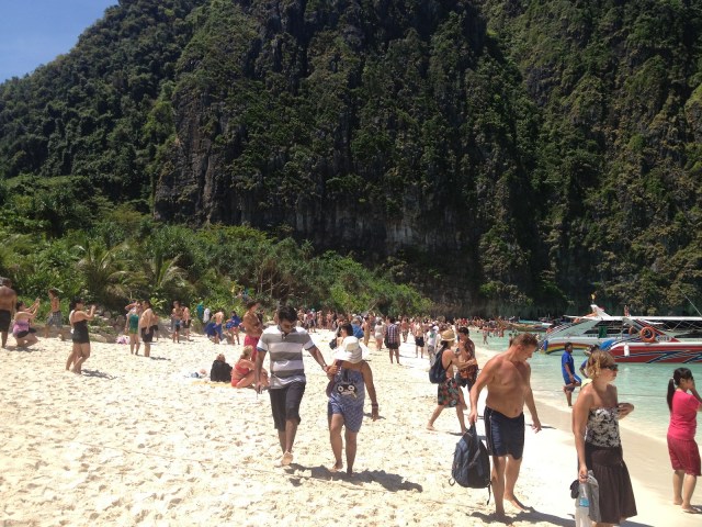 Comunque… dopo Koh Lanta ho pensato bene di seguire le orme di quel gay di Leonardo di Caprio che nel film the Beach raggiunge un’isola sperduta e trova il paradiso. Si tratta di Koh Phi Phi… alla quale la devastazione dello tsunami ha offerto un’ottima occasione per ricostruire tutto da capo, più grande, più moderno, più invadente. Ma non troppo, sinceramente. L’entroterra è tutta giungla e, per lo più, disabitata. Ad eccezione di una striscia di terraferma con DOPPIA spiaggia, davanti e dietro: da una parte discoteche sulla spiaggia con spettacoli infuocati, secchi di vernice fosforescente, gente seminuda che fuma narghilè e sviene nel mare… dall’altra ristorantini, locali chill-out e massaggiatrici sulla spiaggia. Un’ottima ripartizione.