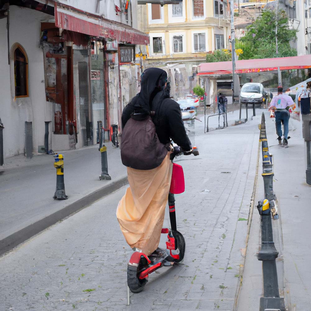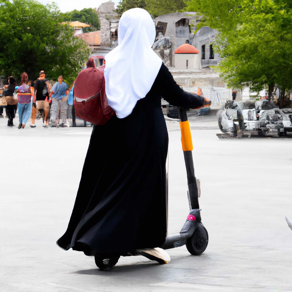 Nel tentativo di catturare il contrasto tra modernità e tradizione ho cercato di immortalare una donna col velo su un monopattino, fallendo più volte. Poi ho scoperto che potevo generare immagini con l’intelligenza artificiale e quindi ho usato Dall-E, che è la mia più recente ossessione… vi sfido a riconoscere qual è la foto vera e quali quelle create dal computer tramite il prompt “muslim woman wearing a veil riding an electric scooter in Istanbul”.