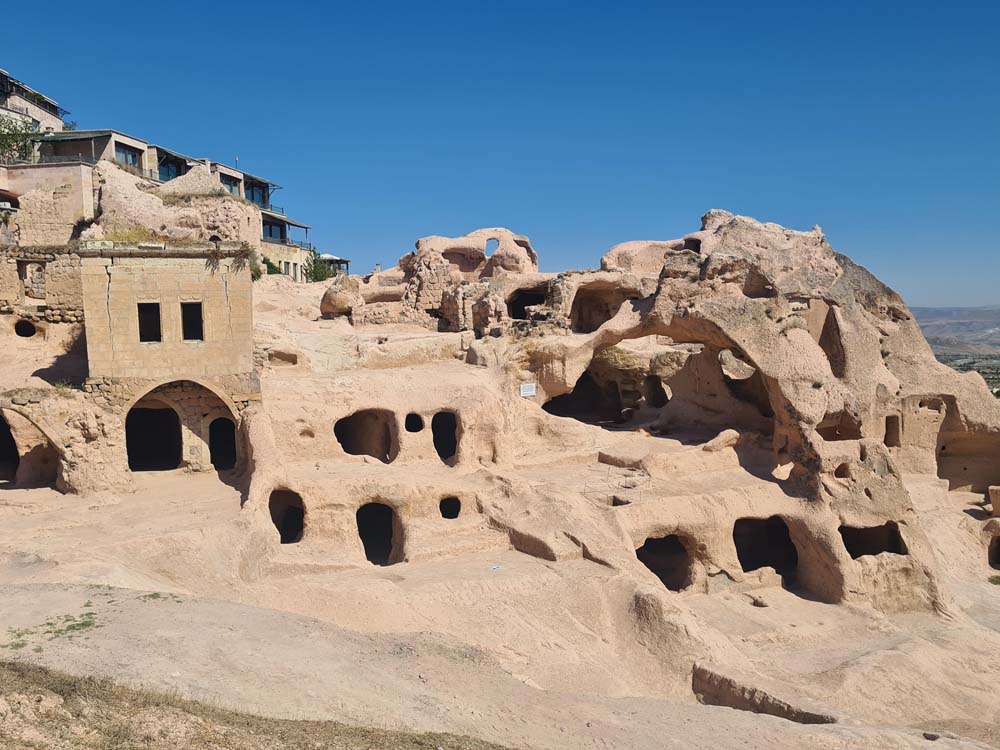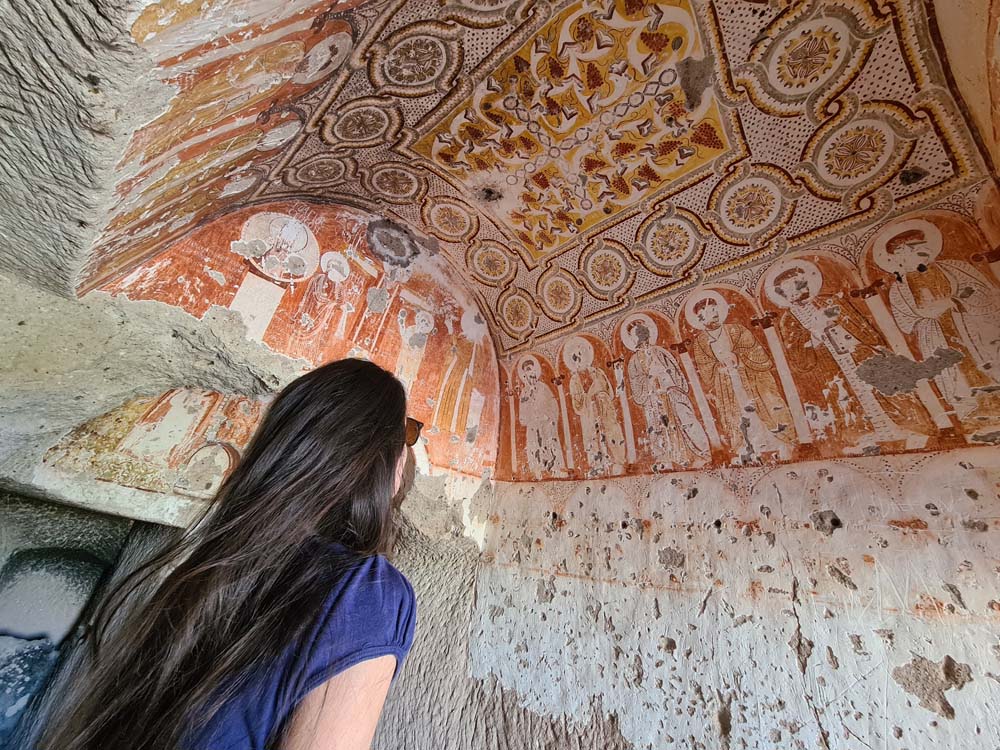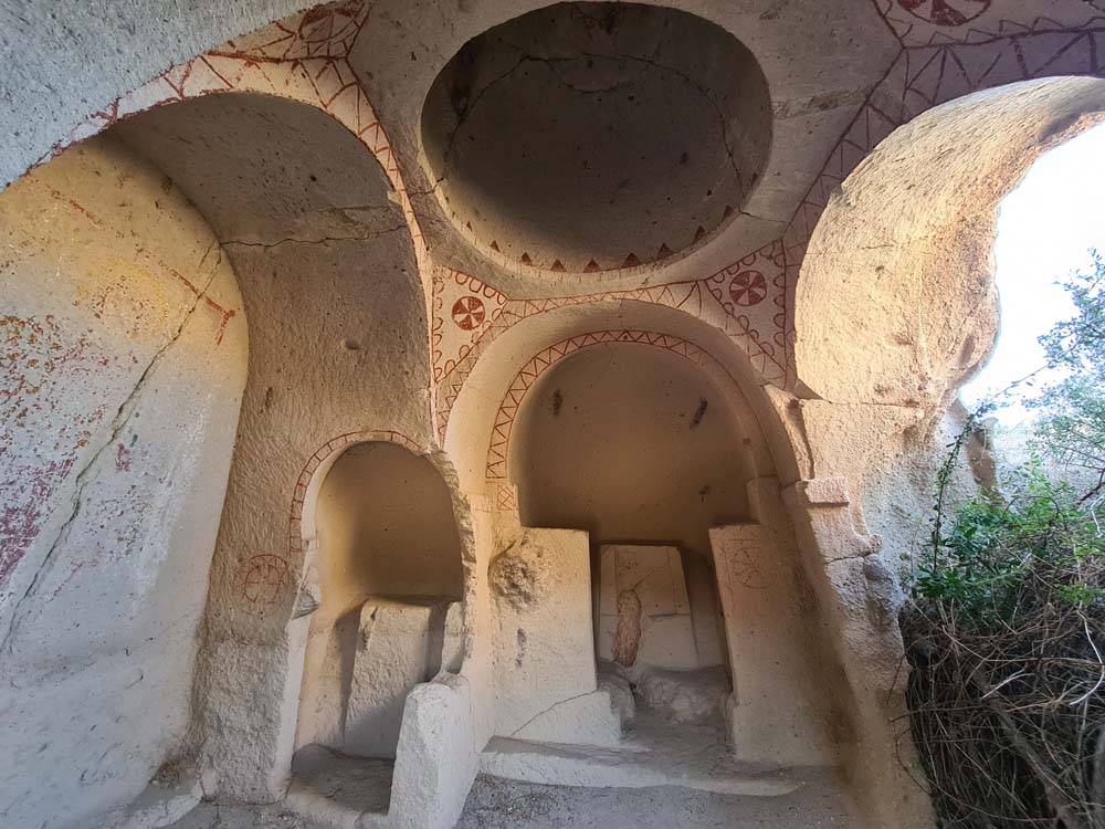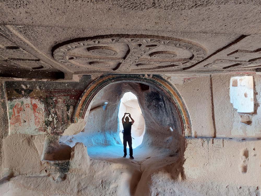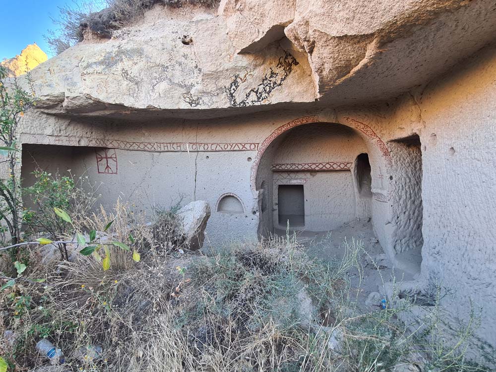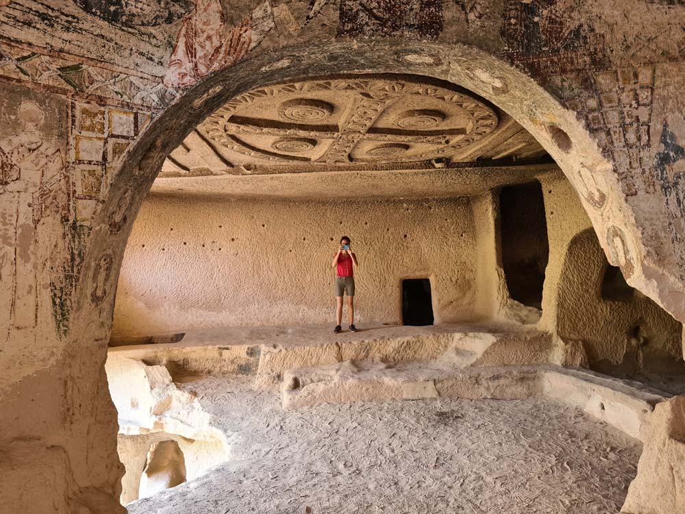 …che sono la cosa meno interessante da vedere, visto che la zona è disseminata di grotte scavate, qualcuna addirittura affrescata. Per vederle tocca fare trekking visto che sono sparse a caso e spesso nascoste dietro ai sassi. A quanto pare vagare per ore sotto il sole non è un’attività che va per la maggiore, visto che siamo stati da soli per tutto il tempo… se si escludono dei cani amichevoli che ci hanno accompagnato per decine di km senza motivo.