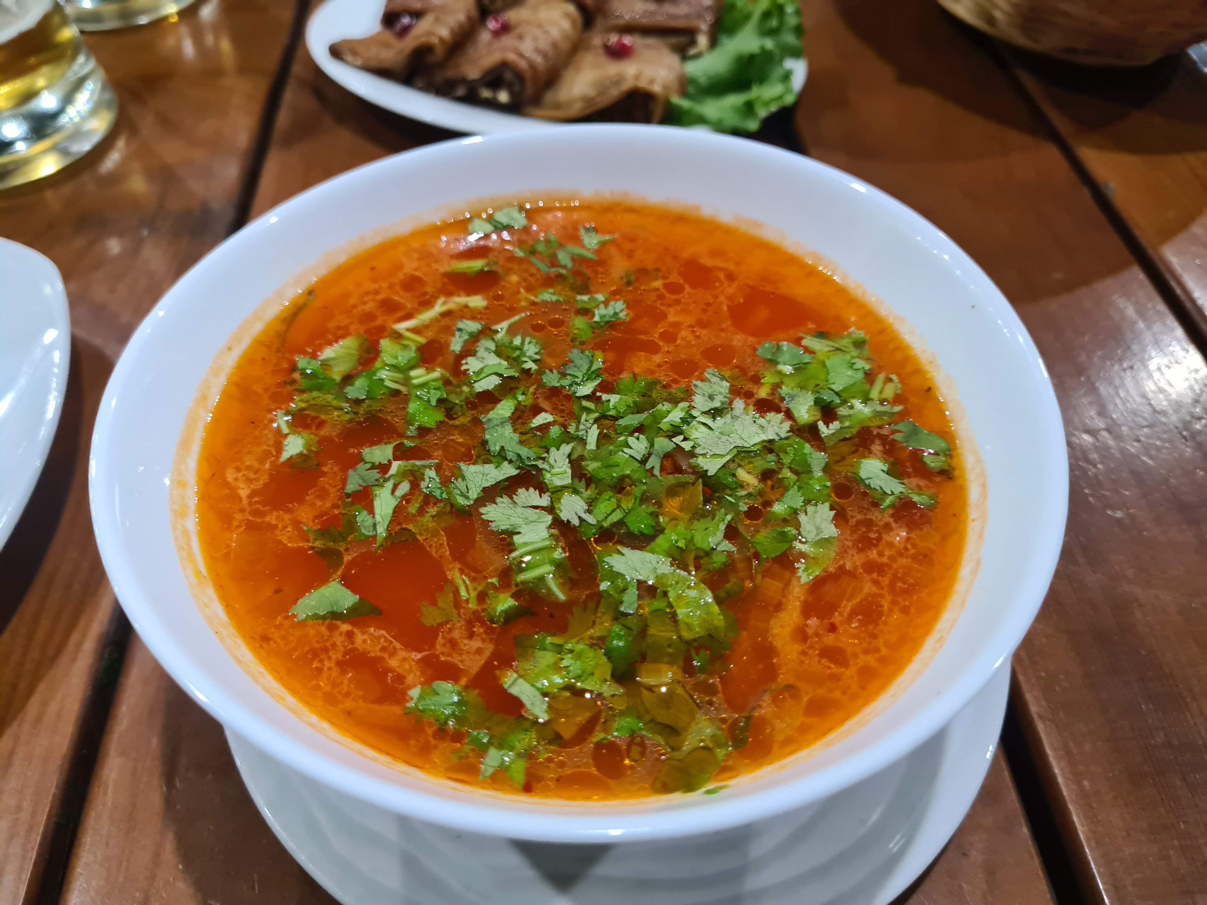 Chikhirtma zuppa senza verdura con lemon curd e pollo